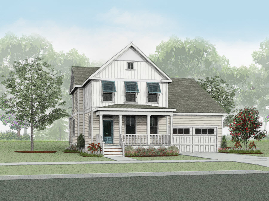 This traditional home with Shaker accents offers both a front porch and a back porch with a patio and grilling area. It featured custom ceiling treatments and crown molding in the foyer, recessed panels in the dining room, shaker trim details throughout, Hardiplank siding and a metal porch roof.
